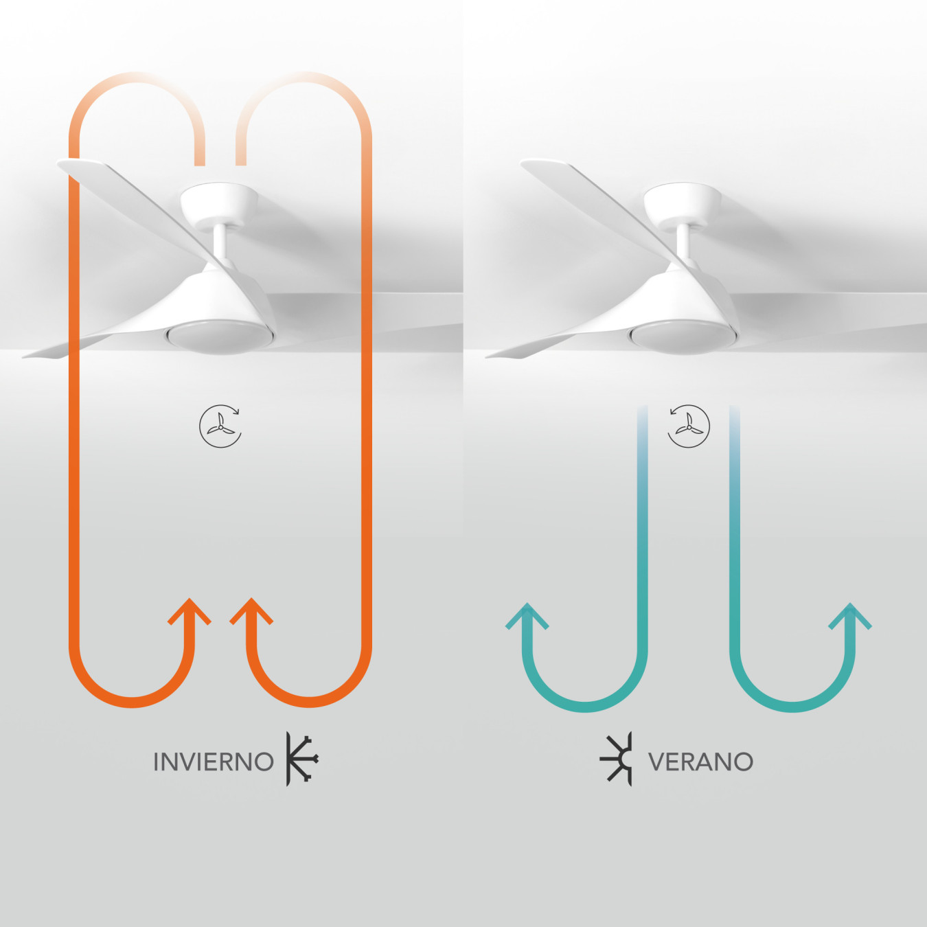 Cambio de dirección de las aspas para optimizar la circulación de aire en cualquier estación. Aire fresco en verano y en invierno, las aspas cambian de dirección para distribuir el aire caliente de manera uniforme.
