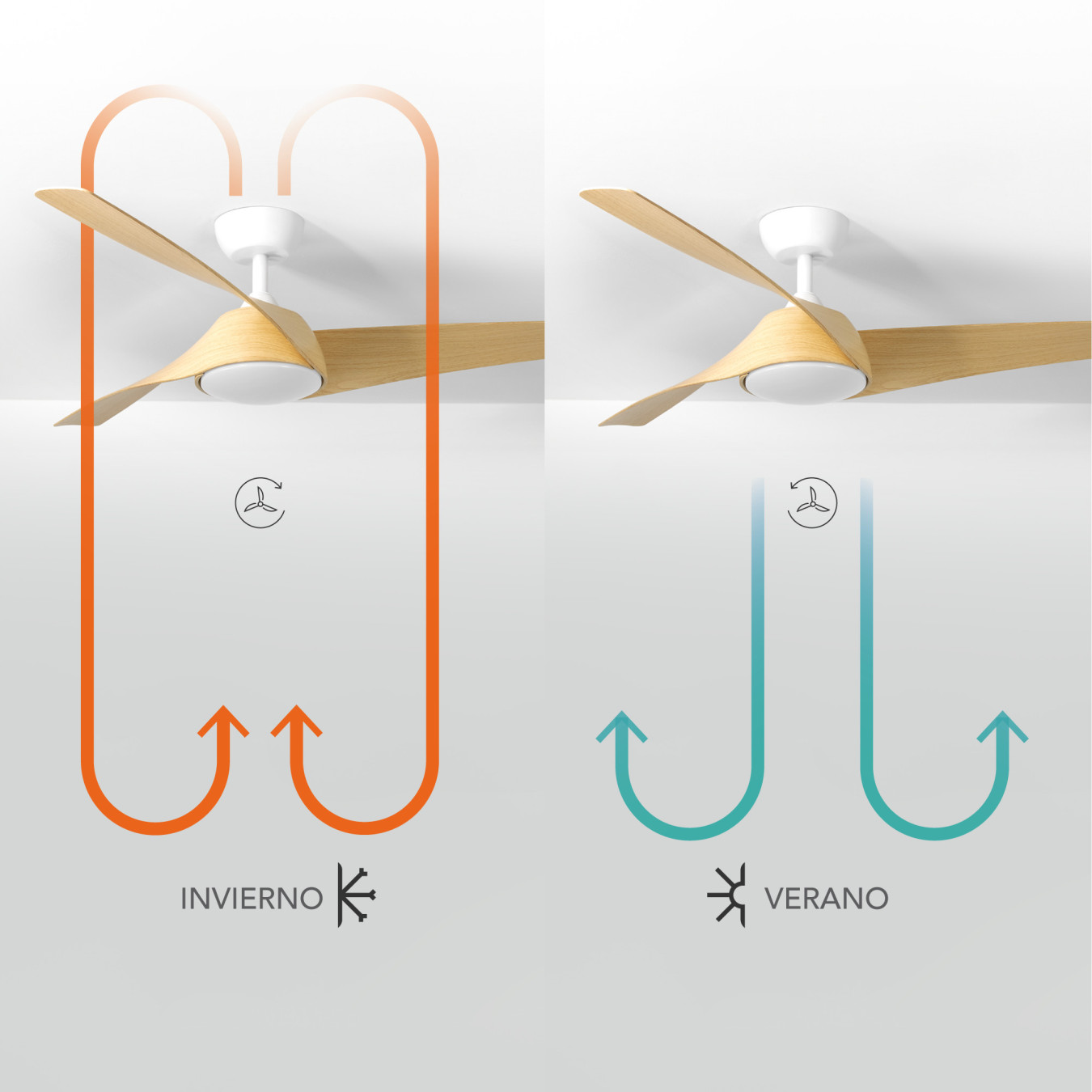 Cambio de dirección de las aspas para optimizar la circulación de aire en cualquier estación. Aire fresco en verano y en invierno, las aspas cambian de dirección para distribuir el aire caliente de manera uniforme.
