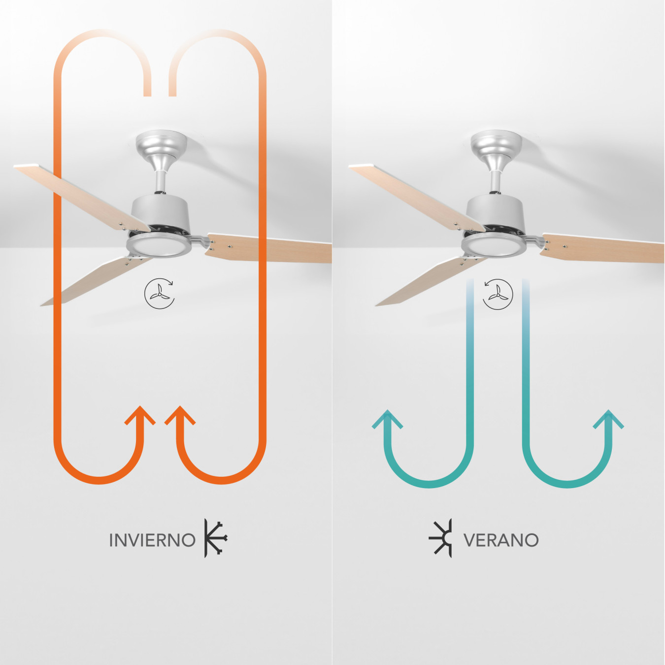 Disfruta de un ambiente confortable en cualquier época del año gracias a la función Invierno/Verano. Este sistema cambia la dirección del giro de las aspas para optimizar la circulación del aire. En verano aire fresco y constante para combatir el calor. En invierno, las aspas invertidas hacen descender el aire caliente y distribuirlo homogéneamente por la habitación, proporcionando una agradable sensación de calor.