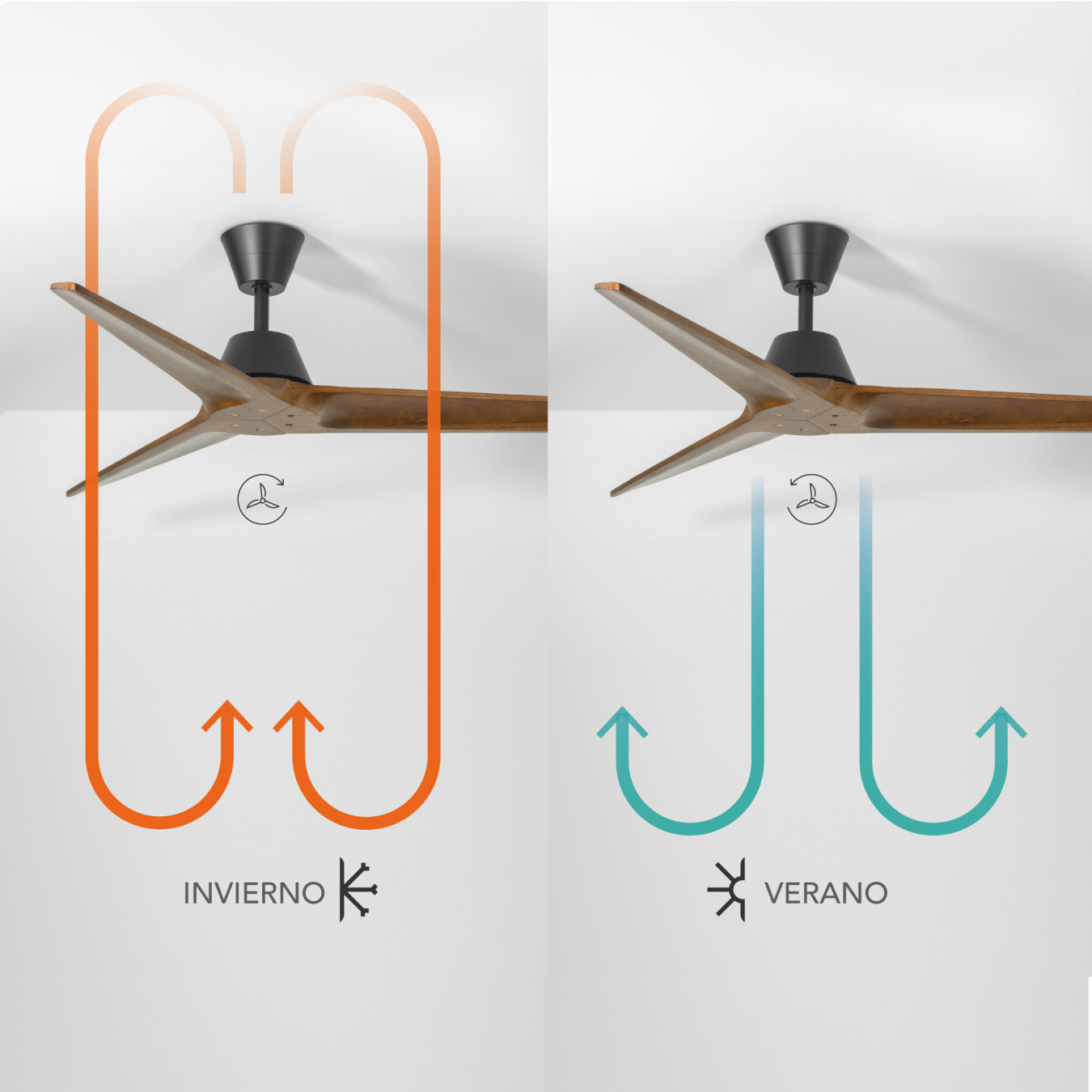 Disfruta de un ambiente confortable en cualquier época del año gracias a la función Invierno/Verano. Este sistema cambia la dirección del giro de las aspas para optimizar la circulación del aire. En verano aire fresco y constante para combatir el calor. En invierno, las aspas invertidas hacen descender el aire caliente y distribuirlo homogéneamente por la habitación, proporcionando una agradable sensación de calor.