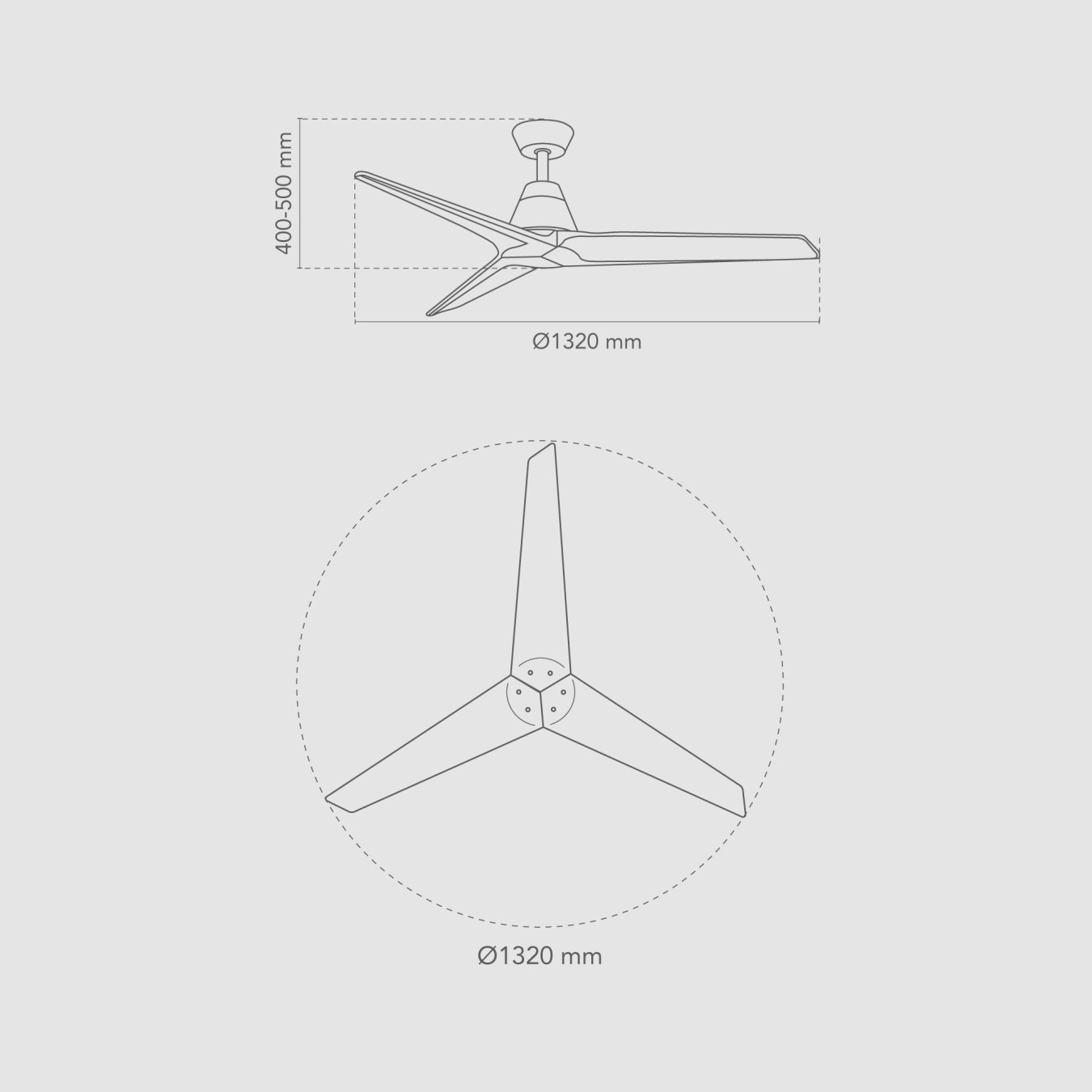 Diseño moderno y minimalista para ofrecer frescura y silencio. Motor DC de acero 35W con un nivel de ruido mínimo, desde 29 dB hasta 41 dB, según la velocidad, proporcionando un ambiente tranquilo y relajante. Potente flujo de aire fresco y constante, eficiente energéticamente. Altura Ajustable 40 cm – 50 cm y Ø132cm. Equilibrado para evitar vibraciones. Instalación sencilla y rápida.